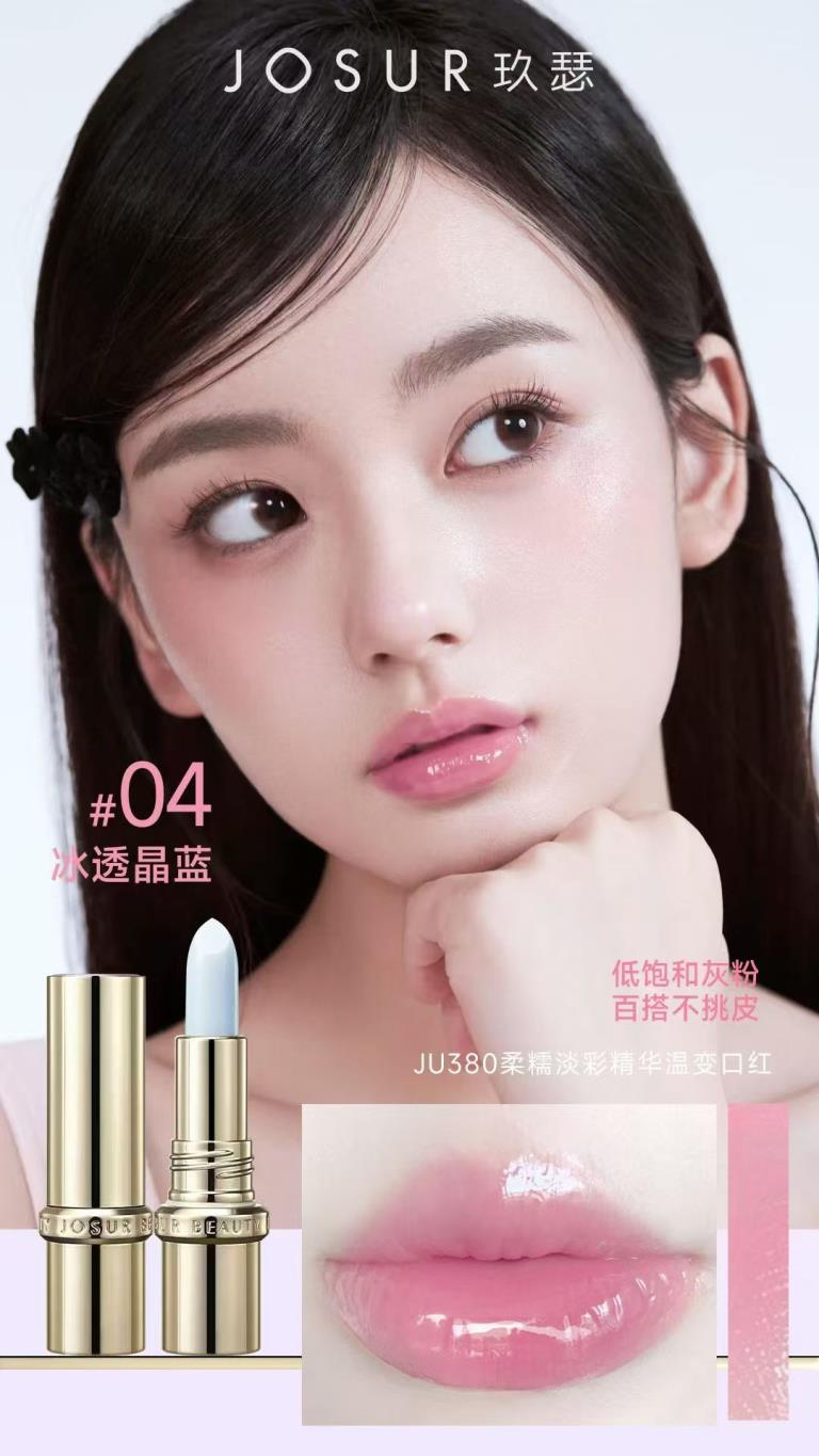 JiuSe – termiczna pomadka-serum o delikatnym kolorze 04 „Lodowy Kryształowy Błękit” 玖瑟 柔糯淡彩精华温变口红04冰